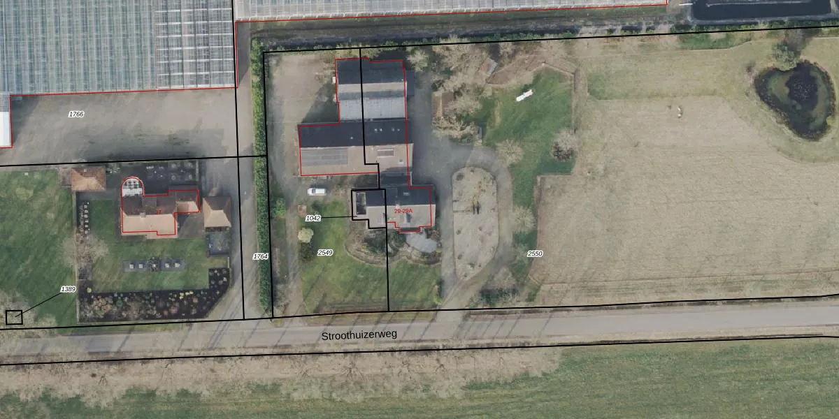 Het perceel waarop Stroothuizerweg 29 staat heeft een oppervlakte van 7955 m². Dit is een zeer groot perceel. De perceeloppervlakte wordt geregistreerd door het Kadaster. Gedetailleerde informatie over de maten van dit perceel kunt u vinden in het rapport Kadastrale kaart met maatvoering van Stroothuizerweg 29.