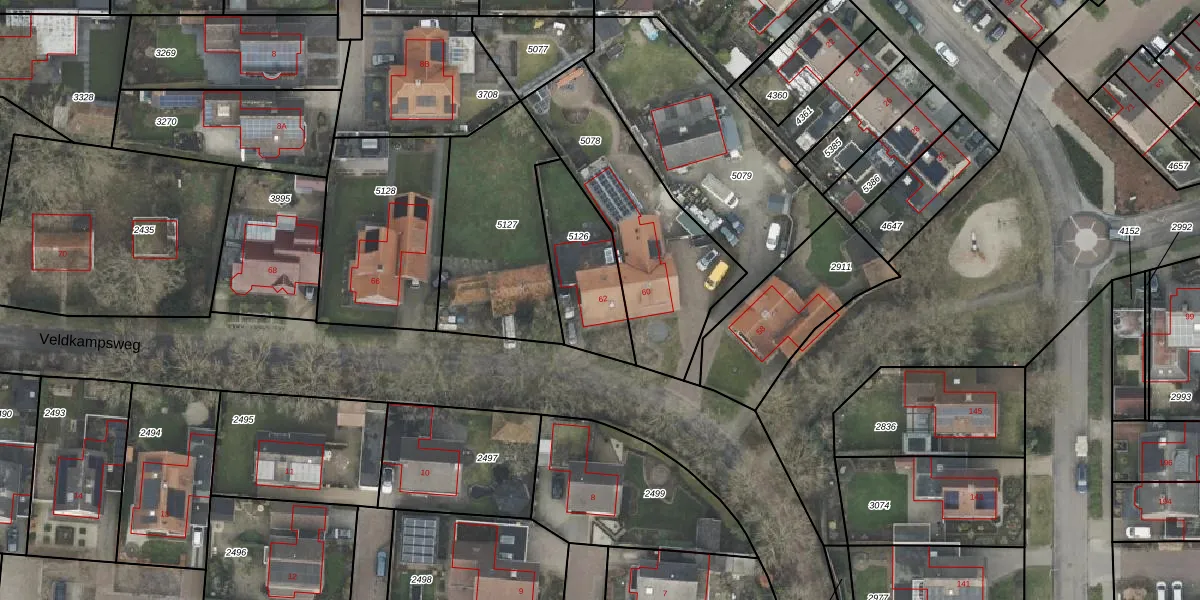 Het perceel waarop Veldkampsweg 62 staat heeft een oppervlakte van 323 m². Dit is een groot perceel. De perceeloppervlakte wordt geregistreerd door het Kadaster. Gedetailleerde informatie over de maten van dit perceel kunt u vinden in het rapport Kadastrale kaart met maatvoering van Veldkampsweg 62.