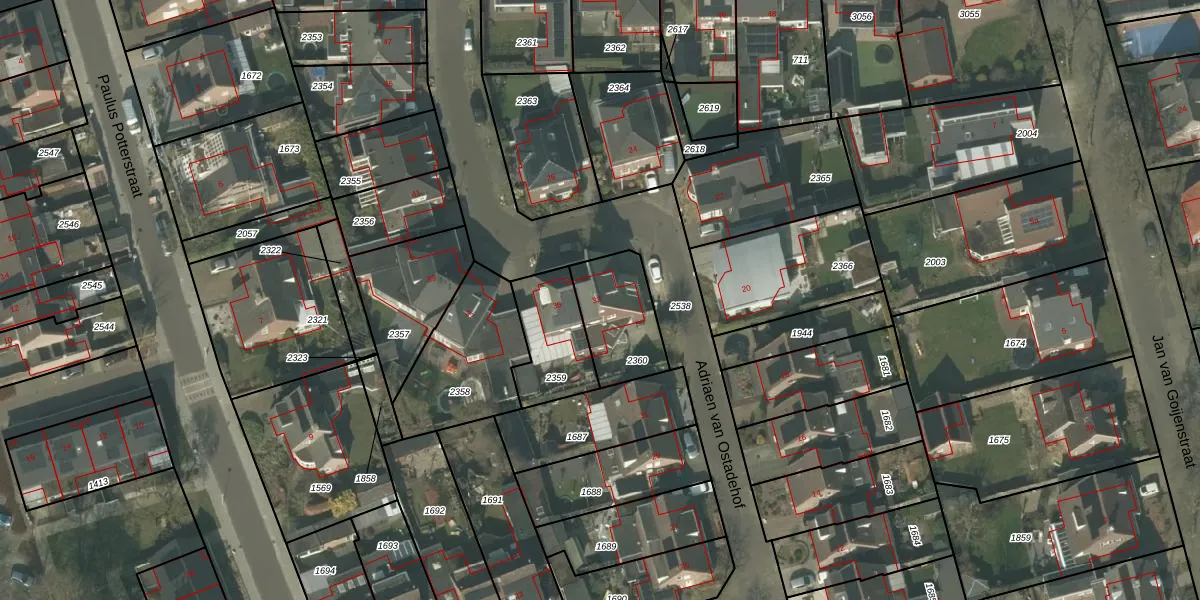 Adriaen van Ostadehof 33 is gelegen op kadastraal perceel DNE00N2360. Deze kadastrale aanduiding is uniek en wordt gebruikt door het Kadaster om eigendomsrechten en andere zakelijke rechten vast te leggen. Het perceel maakt onderdeel uit van de kadastrale gemeente Deurne.