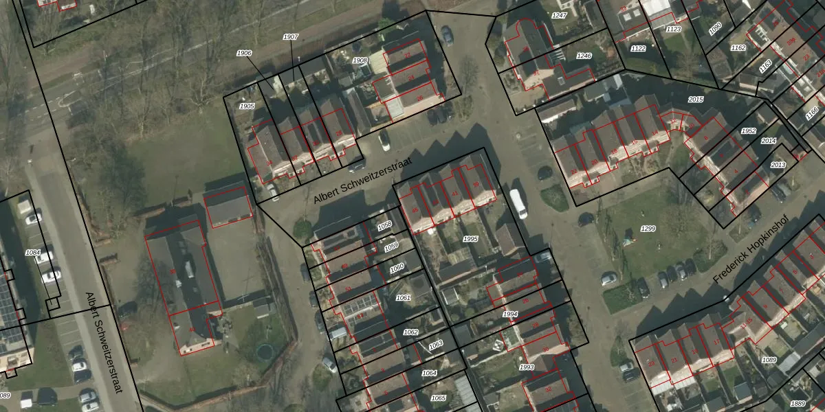 Het perceel waarop Albert Schweitzerstraat 45 staat heeft een oppervlakte van 959 m². Dit is een groot perceel. De perceeloppervlakte wordt geregistreerd door het Kadaster. Gedetailleerde informatie over de maten van dit perceel kunt u vinden in het rapport Kadastrale kaart met maatvoering van Albert Schweitzerstraat 45.