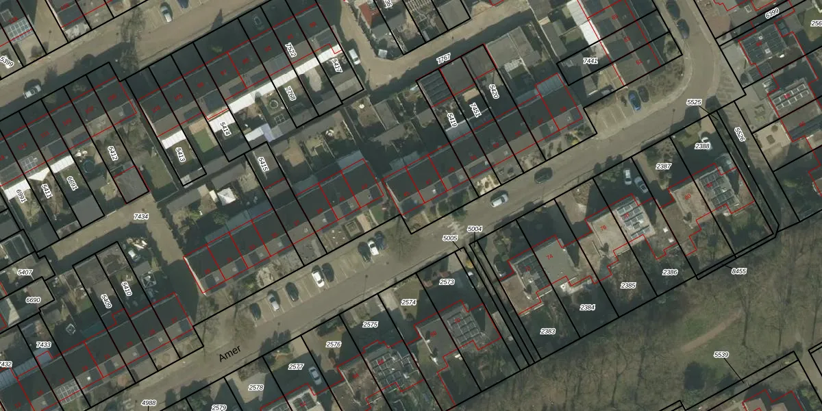 Het perceel waarop Amer 45 staat heeft een oppervlakte van 4378 m². Dit is een zeer groot perceel. De perceeloppervlakte wordt geregistreerd door het Kadaster. Gedetailleerde informatie over de maten van dit perceel kunt u vinden in het rapport Kadastrale kaart met maatvoering van Amer 45.