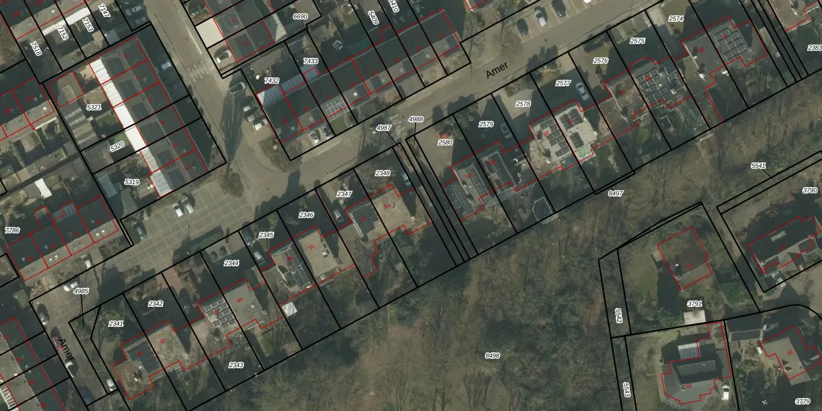 Amer 54 is gelegen op kadastraal perceel DNE00L2348. Deze kadastrale aanduiding is uniek en wordt gebruikt door het Kadaster om eigendomsrechten en andere zakelijke rechten vast te leggen. Het perceel maakt onderdeel uit van de kadastrale gemeente Deurne.