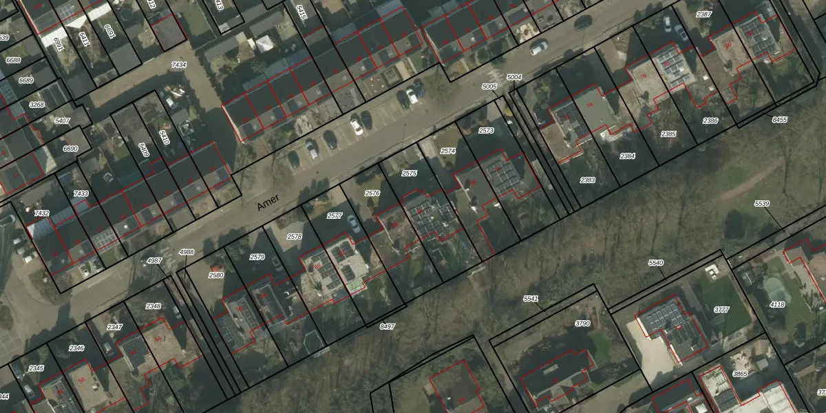 Het perceel waarop Amer 66 staat heeft een oppervlakte van 352 m². Dit is een groot perceel. De perceeloppervlakte wordt geregistreerd door het Kadaster. Gedetailleerde informatie over de maten van dit perceel kunt u vinden in het rapport Kadastrale kaart met maatvoering van Amer 66.
