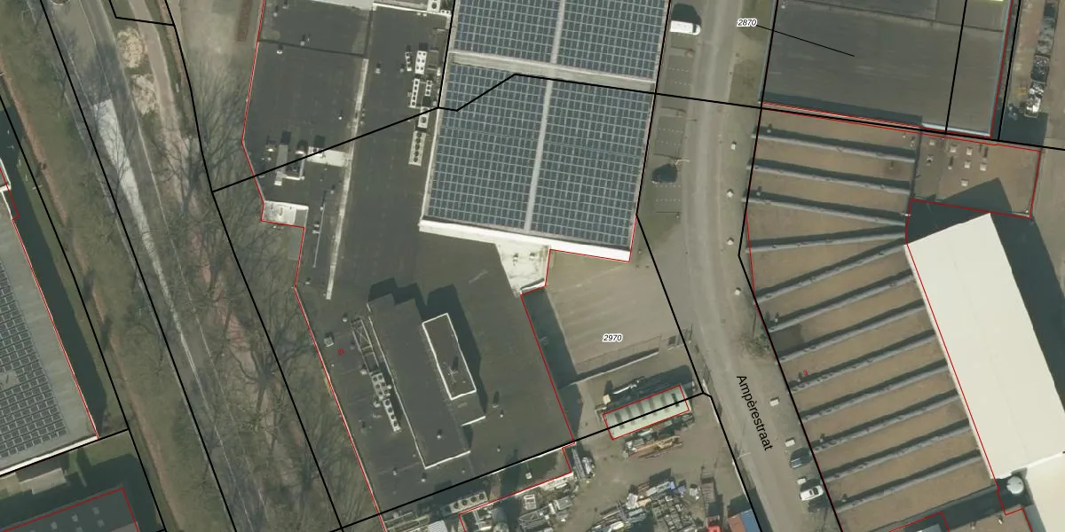 Het perceel waarop Ampèrestraat 2-d staat heeft een oppervlakte van 5015 m². Dit is een zeer groot perceel. De perceeloppervlakte wordt geregistreerd door het Kadaster. Gedetailleerde informatie over de maten van dit perceel kunt u vinden in het rapport Kadastrale kaart met maatvoering van Ampèrestraat 2-d.