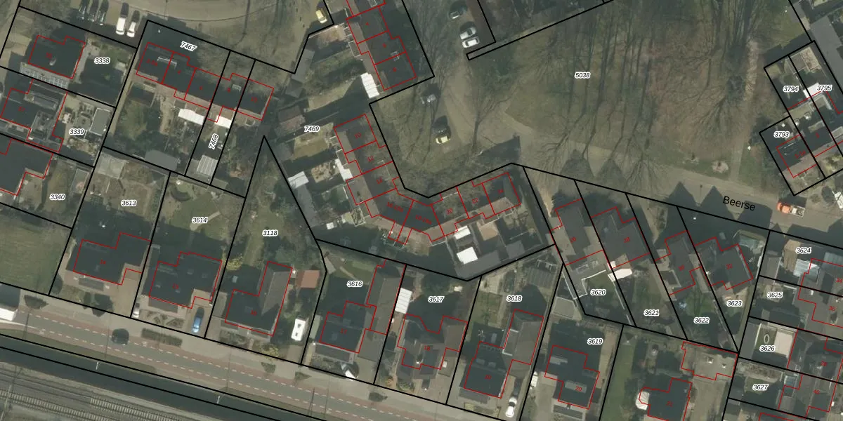 Het perceel waarop Beerse 18 staat heeft een oppervlakte van 2535 m². Dit is een zeer groot perceel. De perceeloppervlakte wordt geregistreerd door het Kadaster. Gedetailleerde informatie over de maten van dit perceel kunt u vinden in het rapport Kadastrale kaart met maatvoering van Beerse 18.