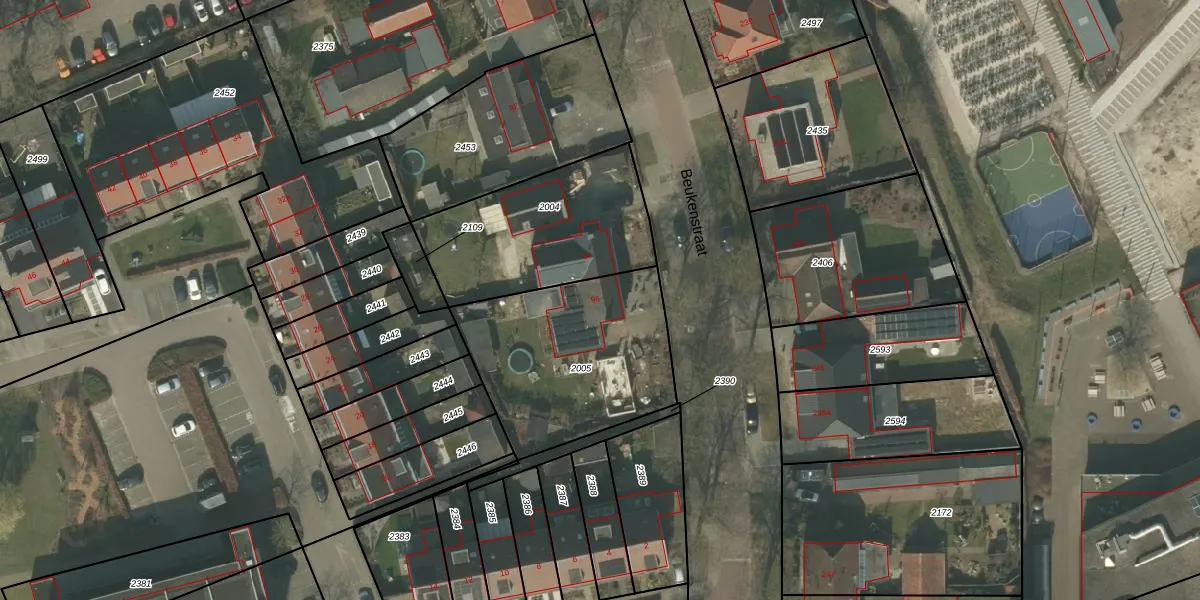Beukenstraat 96 is gelegen op kadastraal perceel DNE00F2005. Deze kadastrale aanduiding is uniek en wordt gebruikt door het Kadaster om eigendomsrechten en andere zakelijke rechten vast te leggen. Het perceel maakt onderdeel uit van de kadastrale gemeente Deurne.