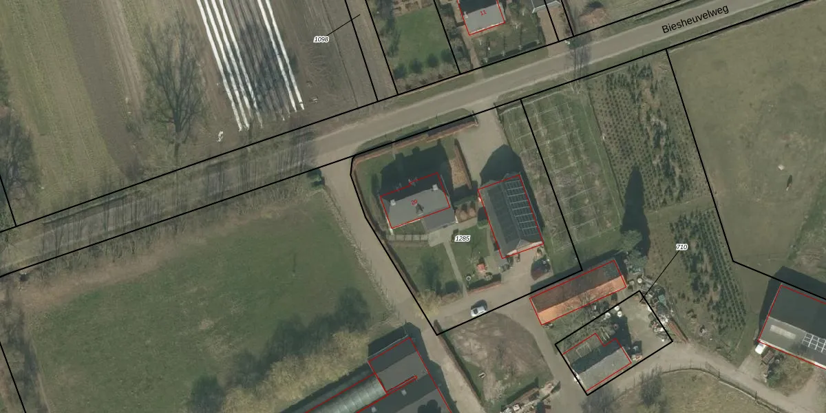 Het perceel waarop Biesheuvelweg 20 staat heeft een oppervlakte van 1965 m². Dit is een zeer groot perceel. De perceeloppervlakte wordt geregistreerd door het Kadaster. Gedetailleerde informatie over de maten van dit perceel kunt u vinden in het rapport Kadastrale kaart met maatvoering van Biesheuvelweg 20.