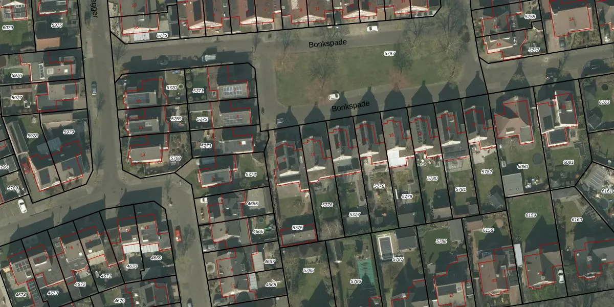 Bonkspade 10 is gelegen op kadastraal perceel DNE00L5776. Deze kadastrale aanduiding is uniek en wordt gebruikt door het Kadaster om eigendomsrechten en andere zakelijke rechten vast te leggen. Het perceel maakt onderdeel uit van de kadastrale gemeente Deurne.