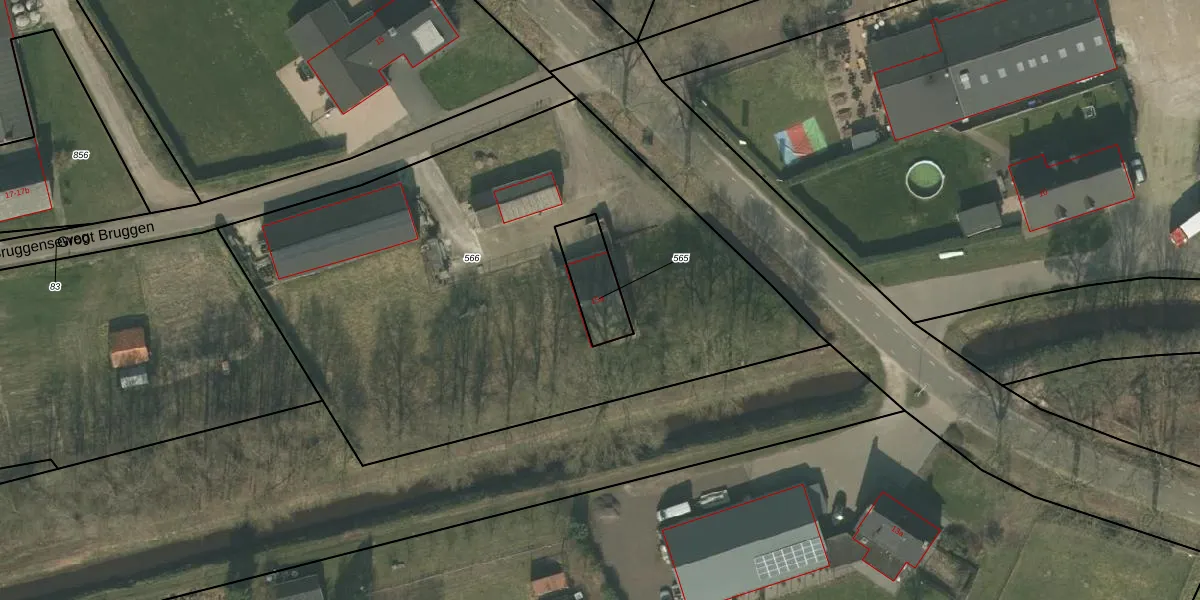 Bruggenseweg 15-a is gelegen op kadastraal perceel DNE00V565. Deze kadastrale aanduiding is uniek en wordt gebruikt door het Kadaster om eigendomsrechten en andere zakelijke rechten vast te leggen. Het perceel maakt onderdeel uit van de kadastrale gemeente Deurne.