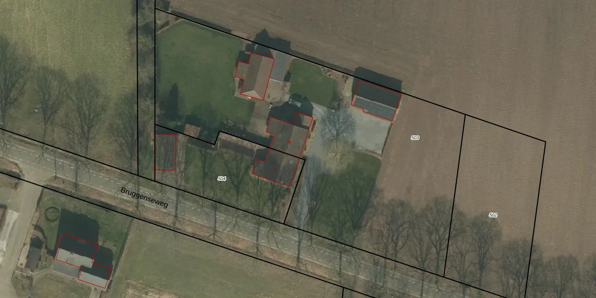 Het perceel waarop Bruggenseweg 6-a staat heeft een oppervlakte van 4750 m². Dit is een zeer groot perceel. De perceeloppervlakte wordt geregistreerd door het Kadaster. Gedetailleerde informatie over de maten van dit perceel kunt u vinden in het rapport Kadastrale kaart met maatvoering van Bruggenseweg 6-a.