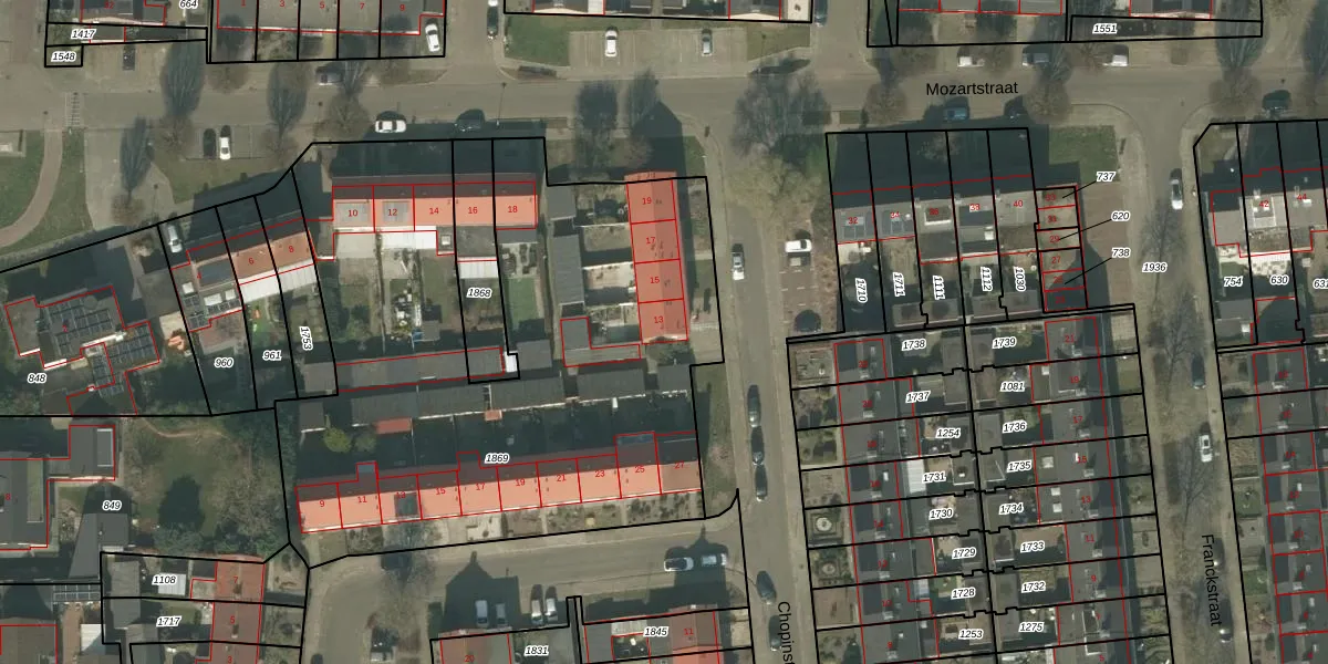 Chopinstraat 13 is gelegen op kadastraal perceel DNE00M1869. Deze kadastrale aanduiding is uniek en wordt gebruikt door het Kadaster om eigendomsrechten en andere zakelijke rechten vast te leggen. Het perceel maakt onderdeel uit van de kadastrale gemeente Deurne.