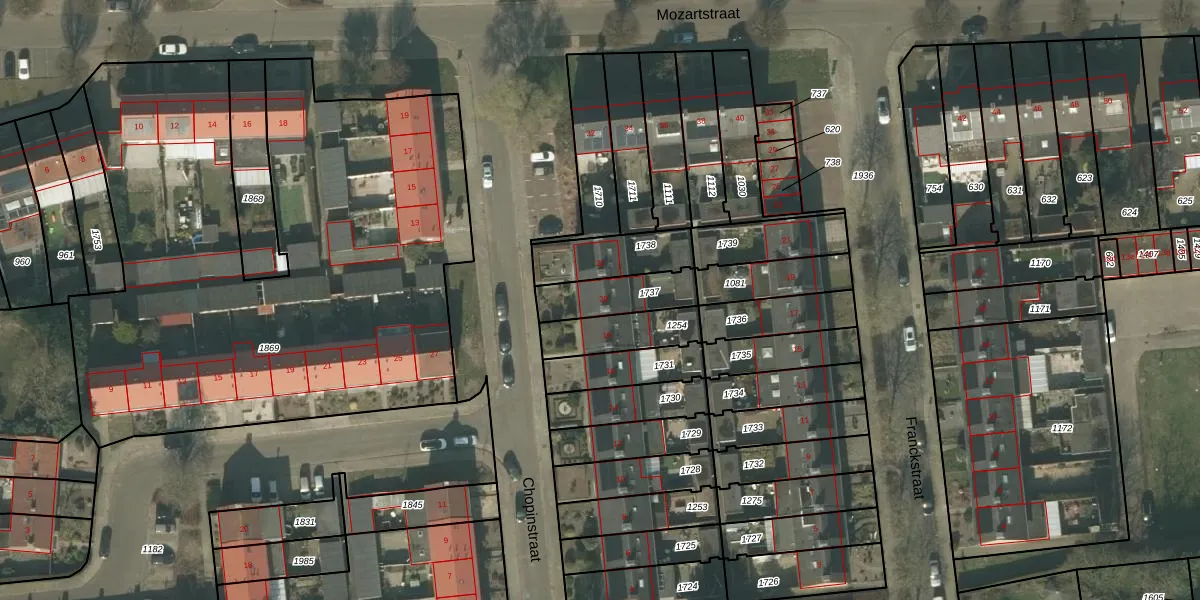 Het perceel waarop Chopinstraat 20 staat heeft een oppervlakte van 166 m². Dit is een middelgroot perceel. De perceeloppervlakte wordt geregistreerd door het Kadaster. Gedetailleerde informatie over de maten van dit perceel kunt u vinden in het rapport Kadastrale kaart met maatvoering van Chopinstraat 20.