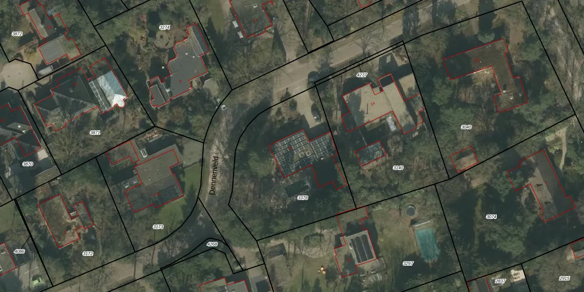 Het perceel waarop Dennenveld 12 staat heeft een oppervlakte van 1495 m². Dit is een zeer groot perceel. De perceeloppervlakte wordt geregistreerd door het Kadaster. Gedetailleerde informatie over de maten van dit perceel kunt u vinden in het rapport Kadastrale kaart met maatvoering van Dennenveld 12.