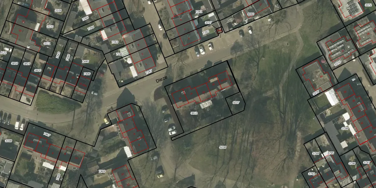 Het perceel waarop Dieze 14 staat heeft een oppervlakte van 930 m². Dit is een groot perceel. De perceeloppervlakte wordt geregistreerd door het Kadaster. Gedetailleerde informatie over de maten van dit perceel kunt u vinden in het rapport Kadastrale kaart met maatvoering van Dieze 14.