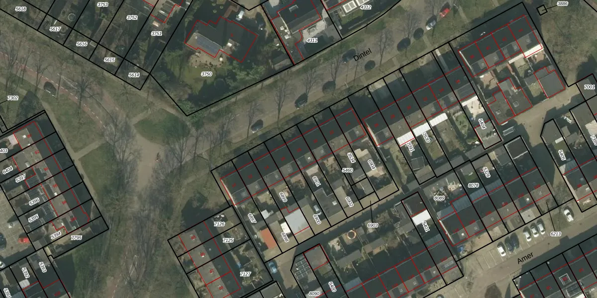 Het perceel waarop Dintel 18 staat heeft een oppervlakte van 222 m². Dit is een middelgroot perceel. De perceeloppervlakte wordt geregistreerd door het Kadaster. Gedetailleerde informatie over de maten van dit perceel kunt u vinden in het rapport Kadastrale kaart met maatvoering van Dintel 18.