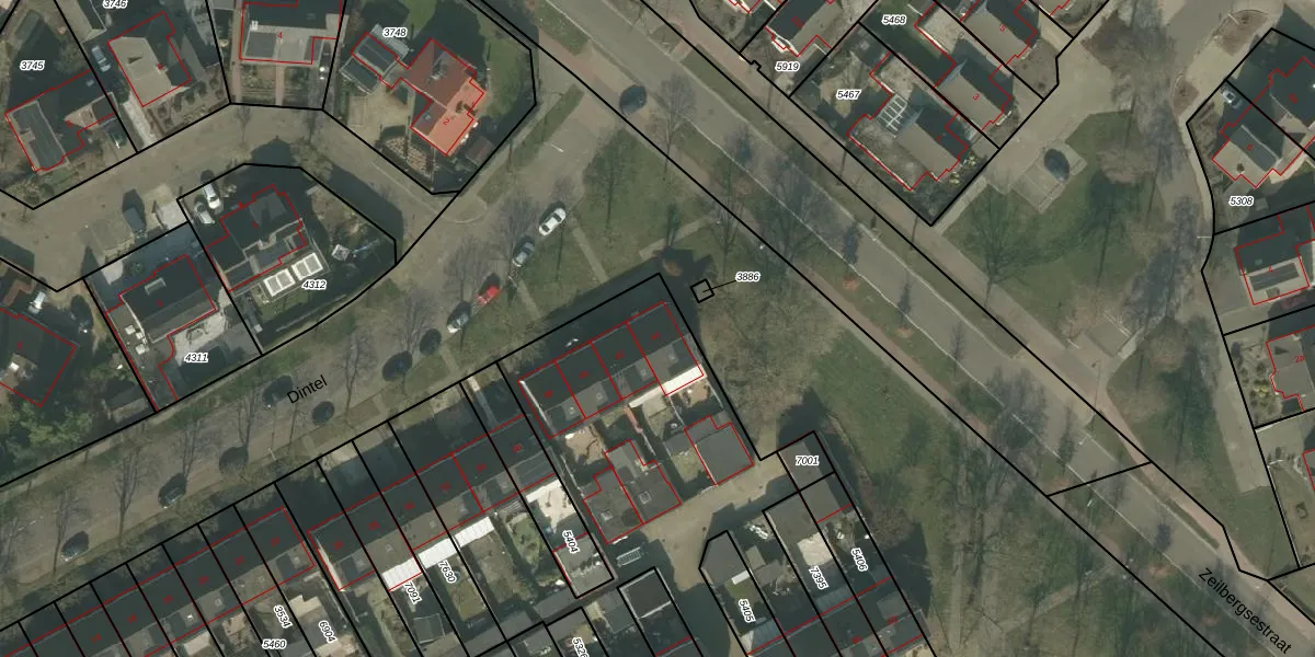 Het perceel waarop Dintel 44 staat heeft een oppervlakte van 4216 m². Dit is een zeer groot perceel. De perceeloppervlakte wordt geregistreerd door het Kadaster. Gedetailleerde informatie over de maten van dit perceel kunt u vinden in het rapport Kadastrale kaart met maatvoering van Dintel 44.