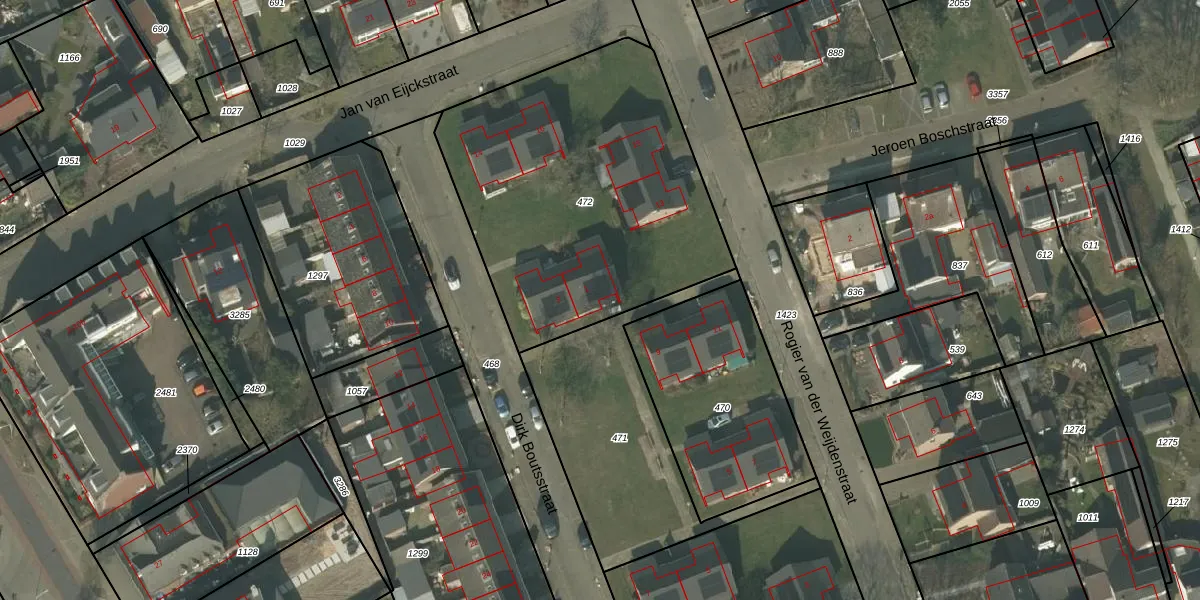 Dirk Boutsstraat 1 is gelegen op kadastraal perceel DNE00N472. Deze kadastrale aanduiding is uniek en wordt gebruikt door het Kadaster om eigendomsrechten en andere zakelijke rechten vast te leggen. Het perceel maakt onderdeel uit van de kadastrale gemeente Deurne.