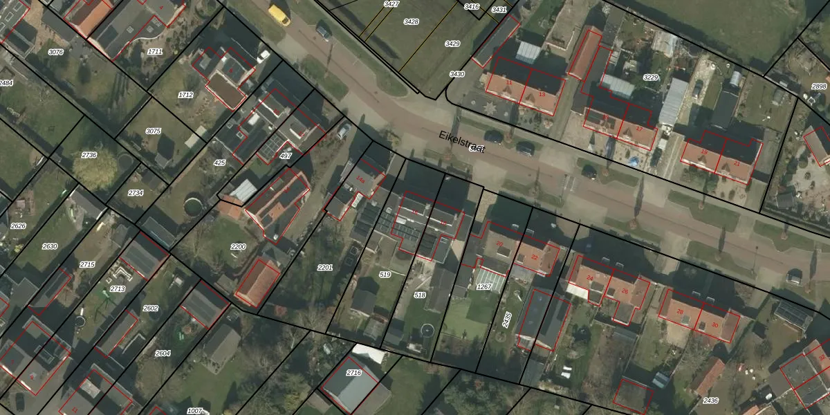 Het perceel waarop Eikelstraat 16 staat heeft een oppervlakte van 545 m². Dit is een groot perceel. De perceeloppervlakte wordt geregistreerd door het Kadaster. Gedetailleerde informatie over de maten van dit perceel kunt u vinden in het rapport Kadastrale kaart met maatvoering van Eikelstraat 16.