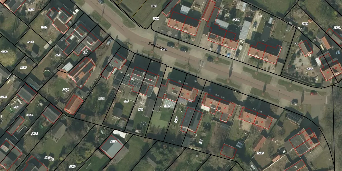 Het perceel waarop Eikelstraat 20 staat heeft een oppervlakte van 515 m². Dit is een groot perceel. De perceeloppervlakte wordt geregistreerd door het Kadaster. Gedetailleerde informatie over de maten van dit perceel kunt u vinden in het rapport Kadastrale kaart met maatvoering van Eikelstraat 20.