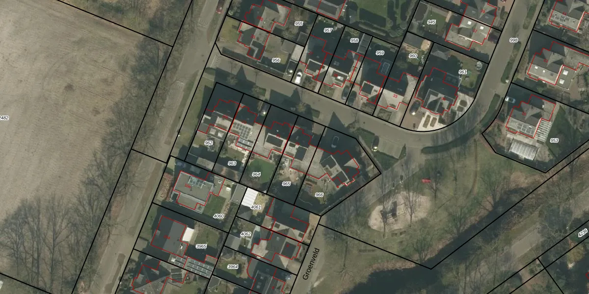 Het perceel waarop Groenveld 19 staat heeft een oppervlakte van 289 m². Dit is een middelgroot perceel. De perceeloppervlakte wordt geregistreerd door het Kadaster. Gedetailleerde informatie over de maten van dit perceel kunt u vinden in het rapport Kadastrale kaart met maatvoering van Groenveld 19.