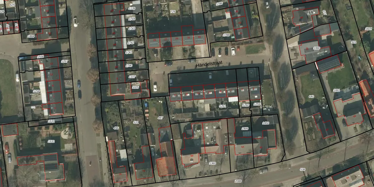 Händelstraat 15 is gelegen op kadastraal perceel DNE00M1261. Deze kadastrale aanduiding is uniek en wordt gebruikt door het Kadaster om eigendomsrechten en andere zakelijke rechten vast te leggen. Het perceel maakt onderdeel uit van de kadastrale gemeente Deurne.