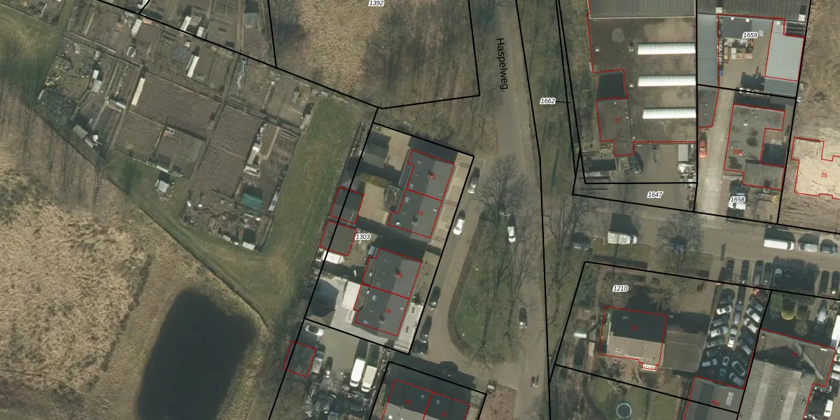 Het perceel waarop Haspelweg 24 staat heeft een oppervlakte van 1297 m². Dit is een zeer groot perceel. De perceeloppervlakte wordt geregistreerd door het Kadaster. Gedetailleerde informatie over de maten van dit perceel kunt u vinden in het rapport Kadastrale kaart met maatvoering van Haspelweg 24.