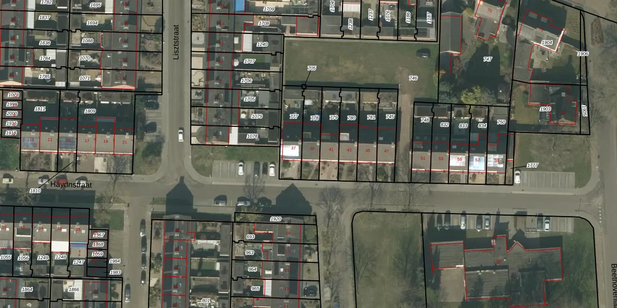 Het perceel waarop Haydnstraat 39 staat heeft een oppervlakte van 182 m². Dit is een middelgroot perceel. De perceeloppervlakte wordt geregistreerd door het Kadaster. Gedetailleerde informatie over de maten van dit perceel kunt u vinden in het rapport Kadastrale kaart met maatvoering van Haydnstraat 39.