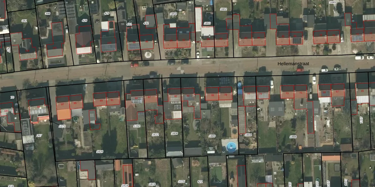 Het perceel waarop Hellemanstraat 83 staat heeft een oppervlakte van 1695 m². Dit is een zeer groot perceel. De perceeloppervlakte wordt geregistreerd door het Kadaster. Gedetailleerde informatie over de maten van dit perceel kunt u vinden in het rapport Kadastrale kaart met maatvoering van Hellemanstraat 83.