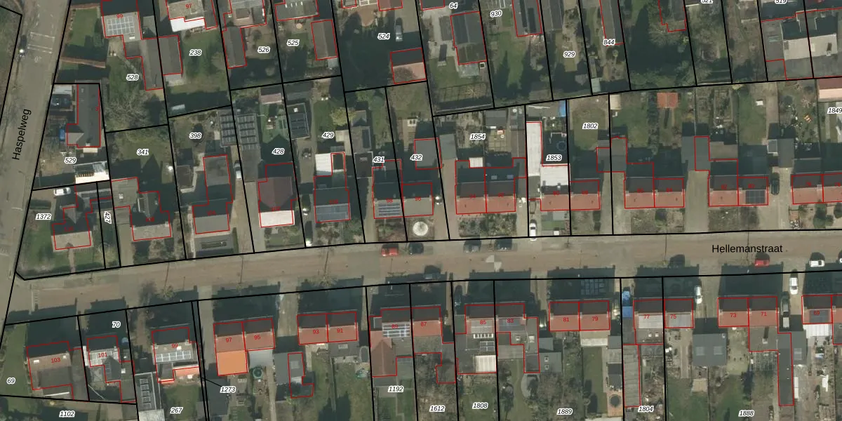 Het perceel waarop Hellemanstraat 96 staat heeft een oppervlakte van 375 m². Dit is een groot perceel. De perceeloppervlakte wordt geregistreerd door het Kadaster. Gedetailleerde informatie over de maten van dit perceel kunt u vinden in het rapport Kadastrale kaart met maatvoering van Hellemanstraat 96.