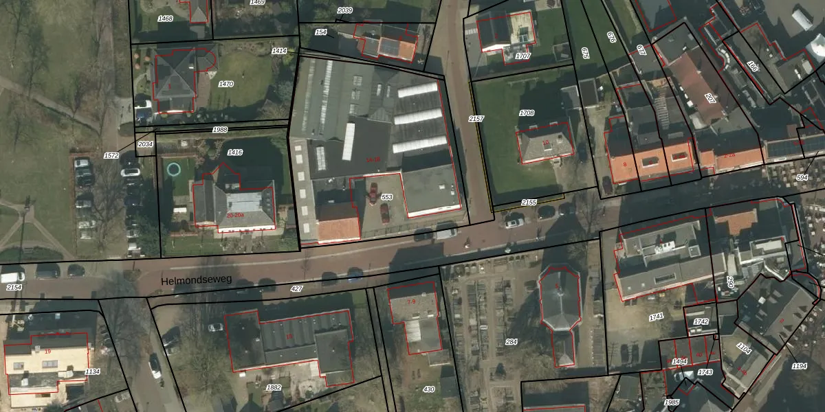 Het perceel waarop Helmondseweg 16 staat heeft een oppervlakte van 1640 m². Dit is een zeer groot perceel. De perceeloppervlakte wordt geregistreerd door het Kadaster. Gedetailleerde informatie over de maten van dit perceel kunt u vinden in het rapport Kadastrale kaart met maatvoering van Helmondseweg 16.