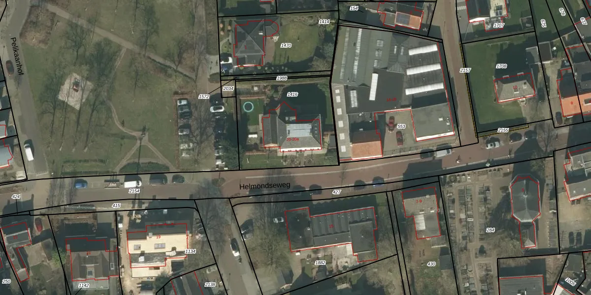 Helmondseweg 20 is gelegen op kadastraal perceel DNE00K1416. Deze kadastrale aanduiding is uniek en wordt gebruikt door het Kadaster om eigendomsrechten en andere zakelijke rechten vast te leggen. Het perceel maakt onderdeel uit van de kadastrale gemeente Deurne.