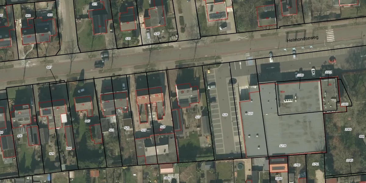 Het perceel waarop Helmondseweg 71 staat heeft een oppervlakte van 1030 m². Dit is een zeer groot perceel. De perceeloppervlakte wordt geregistreerd door het Kadaster. Gedetailleerde informatie over de maten van dit perceel kunt u vinden in het rapport Kadastrale kaart met maatvoering van Helmondseweg 71.