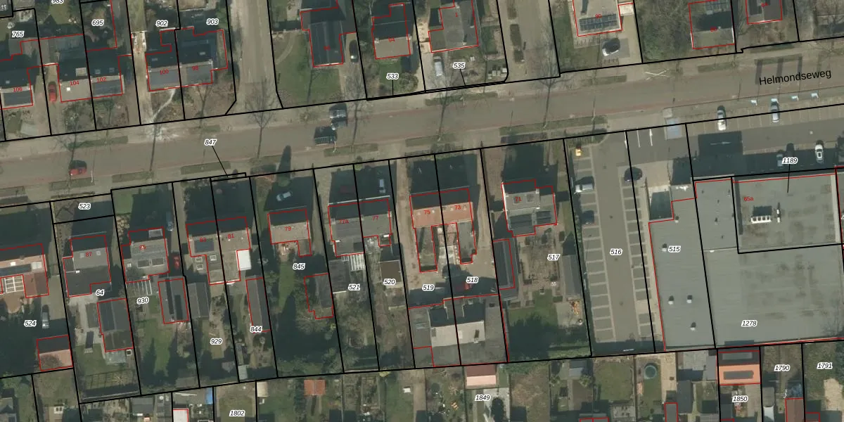 Het perceel waarop Helmondseweg 75 staat heeft een oppervlakte van 553 m². Dit is een groot perceel. De perceeloppervlakte wordt geregistreerd door het Kadaster. Gedetailleerde informatie over de maten van dit perceel kunt u vinden in het rapport Kadastrale kaart met maatvoering van Helmondseweg 75.