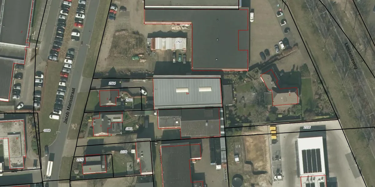 Het perceel waarop Jacob Marisstraat 1-a staat heeft een oppervlakte van 851 m². Dit is een groot perceel. De perceeloppervlakte wordt geregistreerd door het Kadaster. Gedetailleerde informatie over de maten van dit perceel kunt u vinden in het rapport Kadastrale kaart met maatvoering van Jacob Marisstraat 1-a.