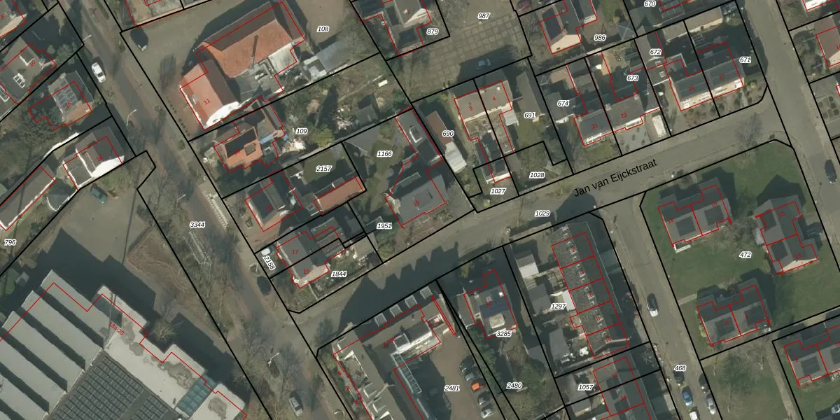 Het perceel waarop Jan van Eijckstraat 19 staat heeft een oppervlakte van 671 m². Dit is een groot perceel. De perceeloppervlakte wordt geregistreerd door het Kadaster. Gedetailleerde informatie over de maten van dit perceel kunt u vinden in het rapport Kadastrale kaart met maatvoering van Jan van Eijckstraat 19.
