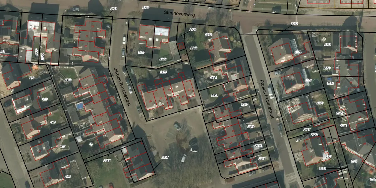 Het perceel waarop Jeroen Boschstraat 22 staat heeft een oppervlakte van 850 m². Dit is een groot perceel. De perceeloppervlakte wordt geregistreerd door het Kadaster. Gedetailleerde informatie over de maten van dit perceel kunt u vinden in het rapport Kadastrale kaart met maatvoering van Jeroen Boschstraat 22.