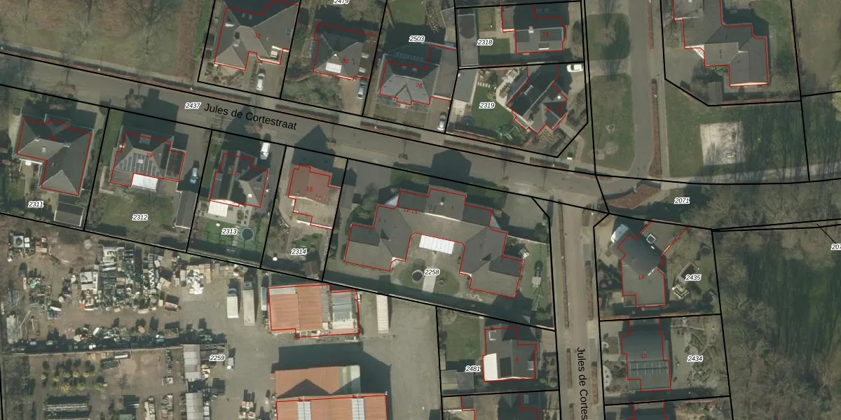 Jules de Cortestraat 13 is gelegen op kadastraal perceel DNE00B2258. Deze kadastrale aanduiding is uniek en wordt gebruikt door het Kadaster om eigendomsrechten en andere zakelijke rechten vast te leggen. Het perceel maakt onderdeel uit van de kadastrale gemeente Deurne.