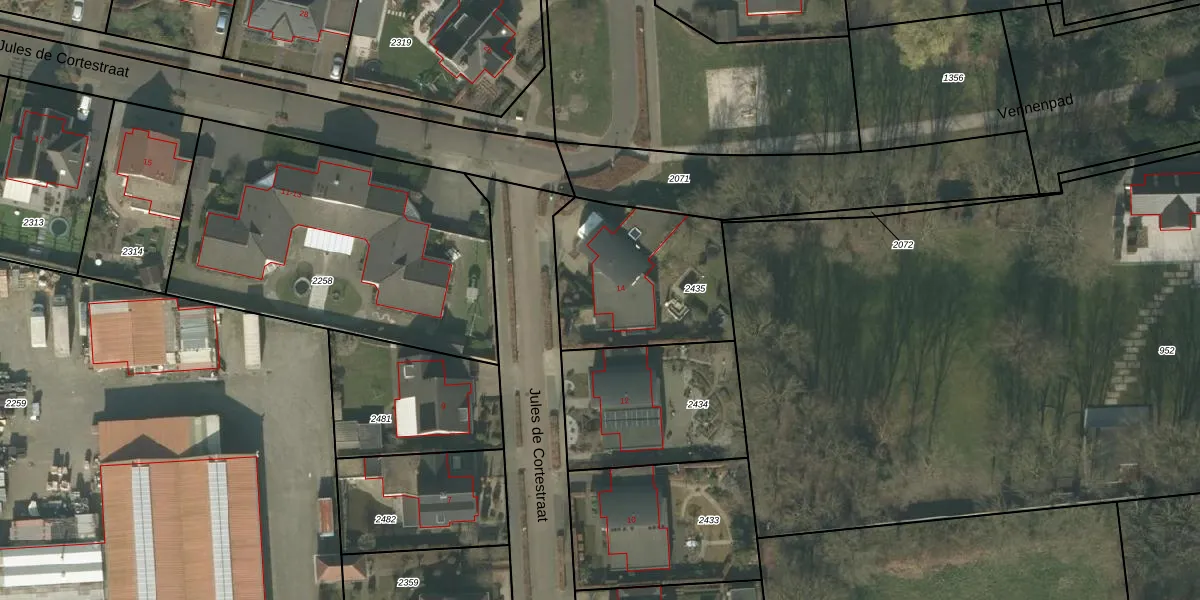 Jules de Cortestraat 14 is gelegen op kadastraal perceel DNE00B2435. Deze kadastrale aanduiding is uniek en wordt gebruikt door het Kadaster om eigendomsrechten en andere zakelijke rechten vast te leggen. Het perceel maakt onderdeel uit van de kadastrale gemeente Deurne.