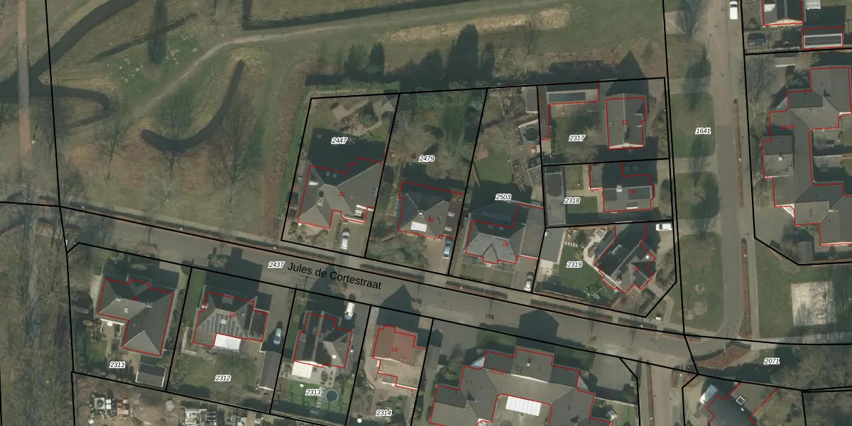 Jules de Cortestraat 30 is gelegen op kadastraal perceel DNE00B2479. Deze kadastrale aanduiding is uniek en wordt gebruikt door het Kadaster om eigendomsrechten en andere zakelijke rechten vast te leggen. Het perceel maakt onderdeel uit van de kadastrale gemeente Deurne.