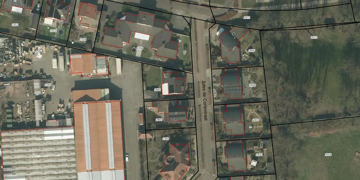 Jules de Cortestraat 9 is gelegen op kadastraal perceel DNE00B2481. Deze kadastrale aanduiding is uniek en wordt gebruikt door het Kadaster om eigendomsrechten en andere zakelijke rechten vast te leggen. Het perceel maakt onderdeel uit van de kadastrale gemeente Deurne.