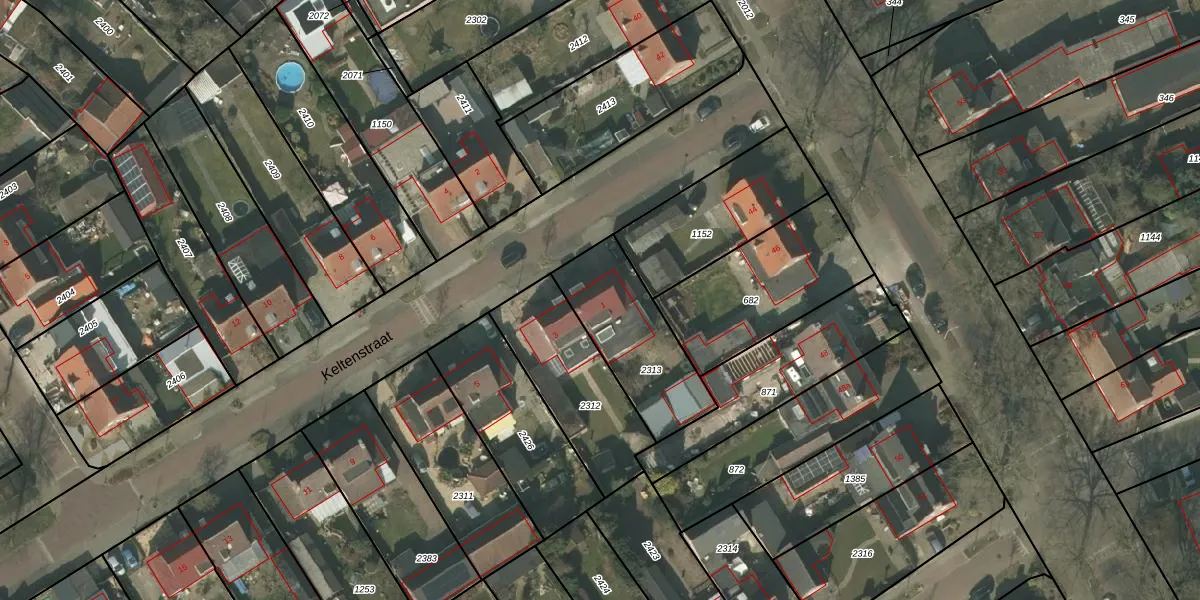 Het perceel waarop Keltenstraat 1 staat heeft een oppervlakte van 405 m². Dit is een groot perceel. De perceeloppervlakte wordt geregistreerd door het Kadaster. Gedetailleerde informatie over de maten van dit perceel kunt u vinden in het rapport Kadastrale kaart met maatvoering van Keltenstraat 1.