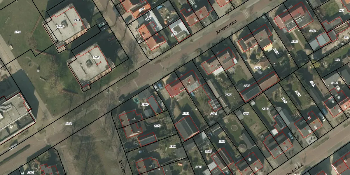 Het perceel waarop Keltenstraat 15 staat heeft een oppervlakte van 595 m². Dit is een groot perceel. De perceeloppervlakte wordt geregistreerd door het Kadaster. Gedetailleerde informatie over de maten van dit perceel kunt u vinden in het rapport Kadastrale kaart met maatvoering van Keltenstraat 15.