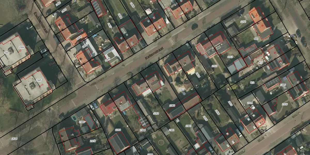 Het perceel waarop Keltenstraat 9 staat heeft een oppervlakte van 454 m². Dit is een groot perceel. De perceeloppervlakte wordt geregistreerd door het Kadaster. Gedetailleerde informatie over de maten van dit perceel kunt u vinden in het rapport Kadastrale kaart met maatvoering van Keltenstraat 9.