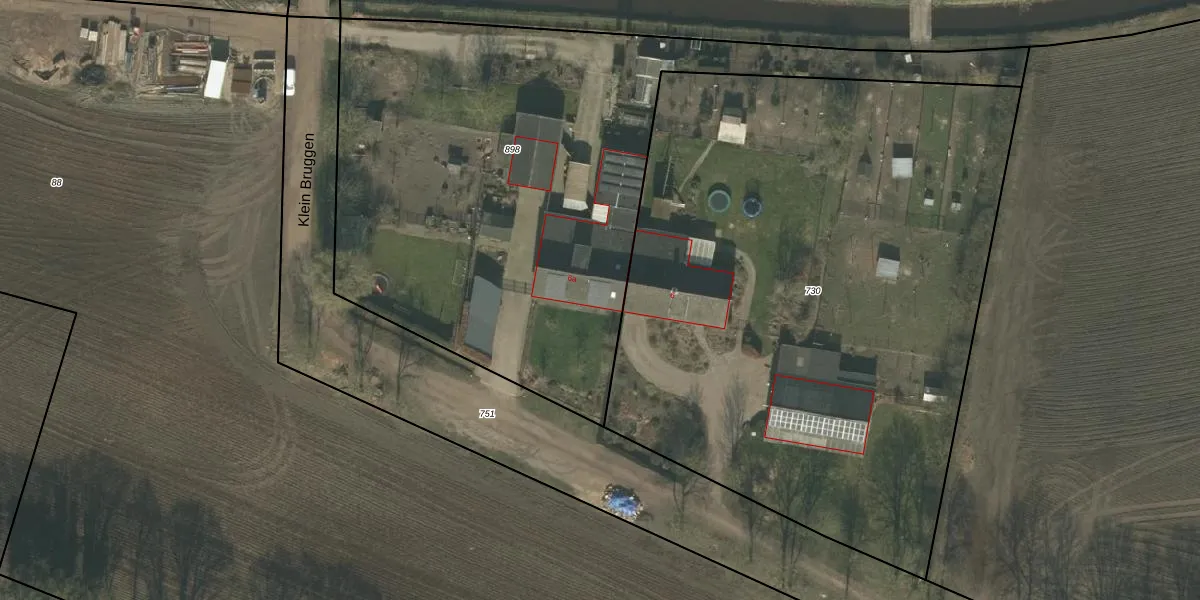 Het perceel waarop Klein Bruggen 6-a staat heeft een oppervlakte van 3180 m². Dit is een zeer groot perceel. De perceeloppervlakte wordt geregistreerd door het Kadaster. Gedetailleerde informatie over de maten van dit perceel kunt u vinden in het rapport Kadastrale kaart met maatvoering van Klein Bruggen 6-a.