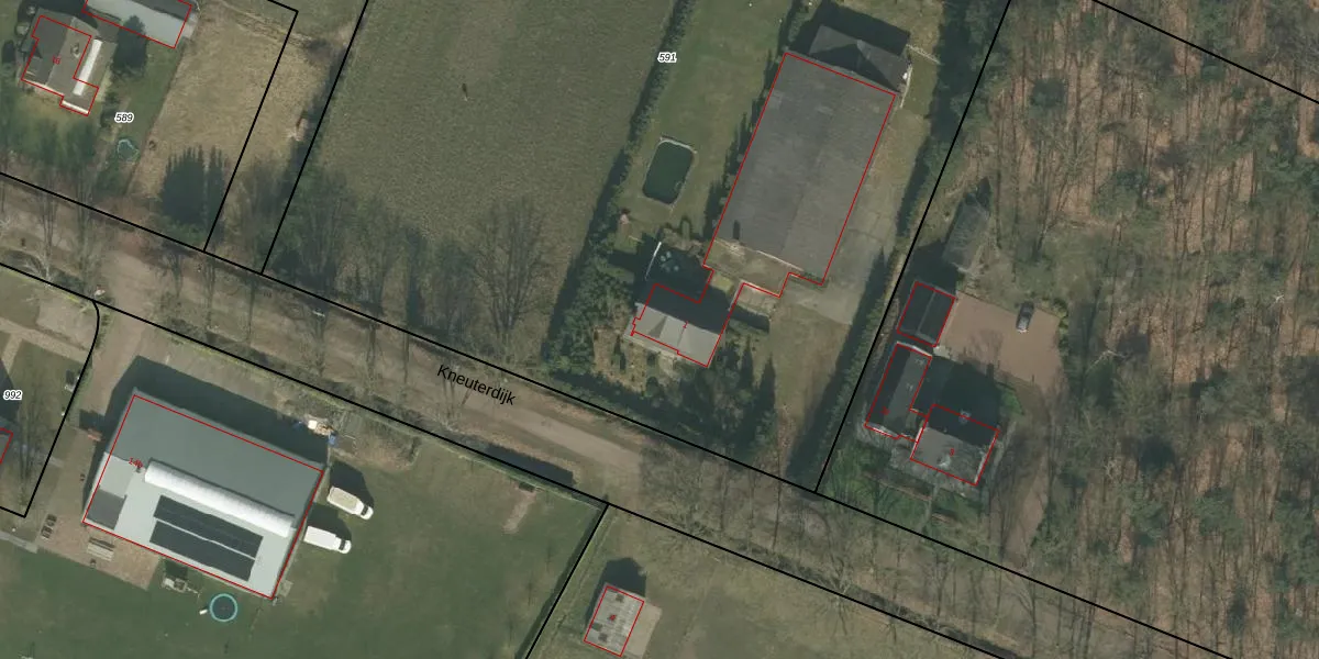Kneuterdijk 1 is gelegen op kadastraal perceel DNE00V591. Deze kadastrale aanduiding is uniek en wordt gebruikt door het Kadaster om eigendomsrechten en andere zakelijke rechten vast te leggen. Het perceel maakt onderdeel uit van de kadastrale gemeente Deurne.
