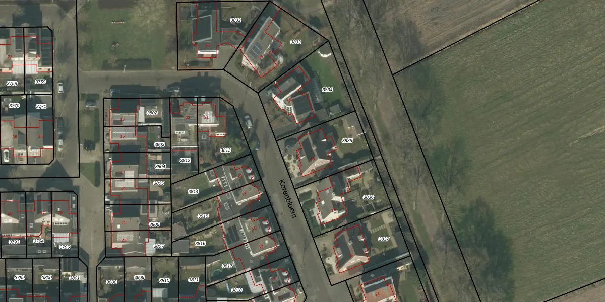 Korenbloem 20 is gelegen op kadastraal perceel DNE00C3835. Deze kadastrale aanduiding is uniek en wordt gebruikt door het Kadaster om eigendomsrechten en andere zakelijke rechten vast te leggen. Het perceel maakt onderdeel uit van de kadastrale gemeente Deurne.