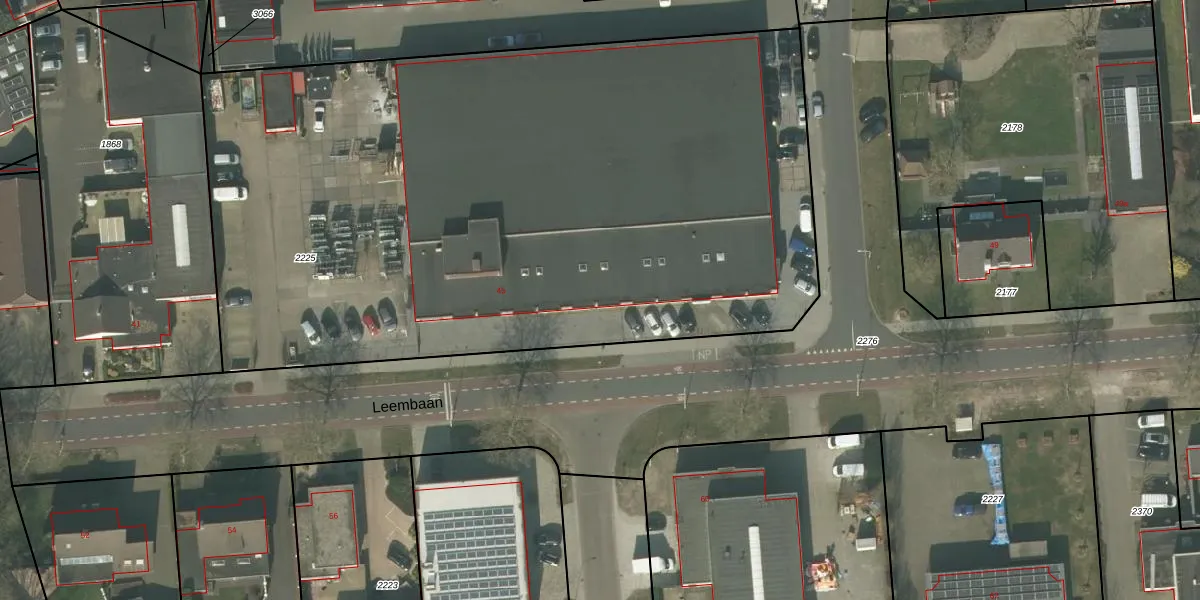 Het perceel waarop Leembaan 45 staat heeft een oppervlakte van 4995 m². Dit is een zeer groot perceel. De perceeloppervlakte wordt geregistreerd door het Kadaster. Gedetailleerde informatie over de maten van dit perceel kunt u vinden in het rapport Kadastrale kaart met maatvoering van Leembaan 45.
