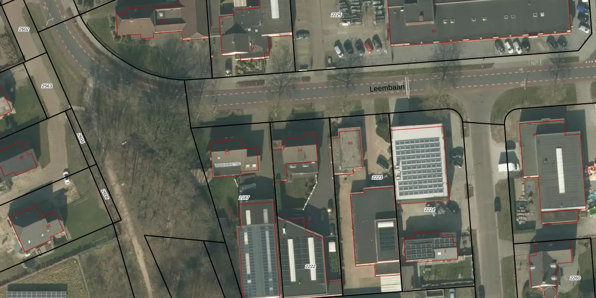 Leembaan 54 is gelegen op kadastraal perceel DNE00F2222. Deze kadastrale aanduiding is uniek en wordt gebruikt door het Kadaster om eigendomsrechten en andere zakelijke rechten vast te leggen. Het perceel maakt onderdeel uit van de kadastrale gemeente Deurne.