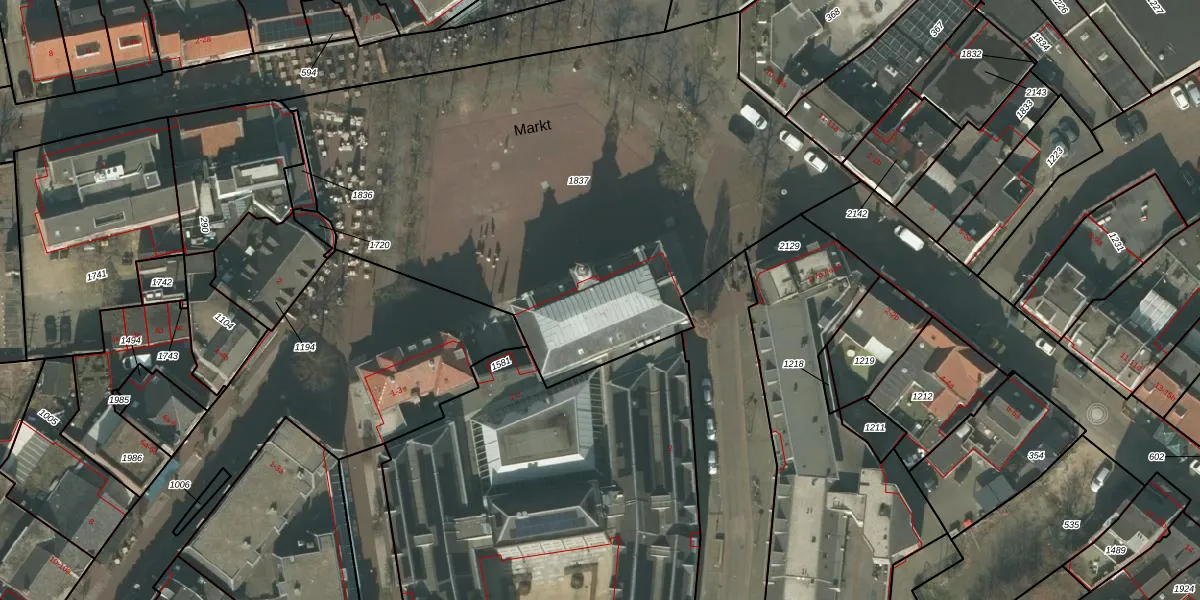 Het perceel waarop Markt 1 staat heeft een oppervlakte van 3336 m². Dit is een zeer groot perceel. De perceeloppervlakte wordt geregistreerd door het Kadaster. Gedetailleerde informatie over de maten van dit perceel kunt u vinden in het rapport Kadastrale kaart met maatvoering van Markt 1.