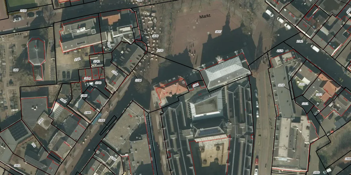 Het perceel waarop Markt 2 staat heeft een oppervlakte van 4358 m². Dit is een zeer groot perceel. De perceeloppervlakte wordt geregistreerd door het Kadaster. Gedetailleerde informatie over de maten van dit perceel kunt u vinden in het rapport Kadastrale kaart met maatvoering van Markt 2.